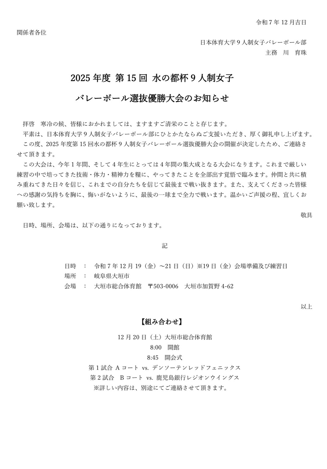2025年度 第15回 水の都杯9人制女子 バレーボール選抜優勝大会のお知らせ